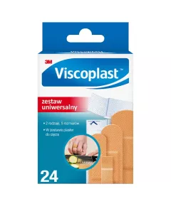 Dane produktowe Viscoplast Zestaw plastrów uniwersalny 5 rozmiarów 24 sztuki Zestaw Uniwersalny marki Viscoplast™ to zestaw 24 plastrów, w 5 różnych rozmiarach o dobrej adhezji. W skład zestawu wchodzi plaster do cięcia. Wszystkie z plastrów zostały wykonane z przepuszczających...