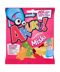 Dane produktowe AKUKU! Charakterne Miśki Żelki o obniżonej zawartości cukrów 90 g Składniki: syrop glukozowy, cukier, sok owocowy 20% (z zagęszczonego soku owocowego), woda, żelatyna wieprzowa, regulator kwasowości: kwas jabłkowy, koncentraty roślinne: marchew, pomarańczowa marchew,...