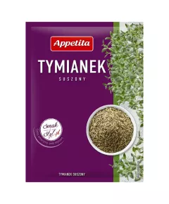 Dane produktowe Appetita Tymianek 10 g Czy wiesz że... W Polsce występuje 12 gatunków tymianku, z których najpospolitszym jest macierzanka zwyczajna, rosnąca na suchych łąkach, pastwiskach i murawach. Składniki: Dodatki Marka Appetita Dodatkowe informacje Polecam, Ewa...