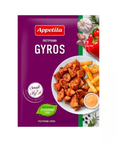 Dane produktowe Appetita Przyprawa gyros 30 g Składniki: sól, papryka słodka, czosnek (10,5%), cebula, kminek, cukier, pieprz czarny, cząber, kolendra, tymianek, chilli (3,5%), GORCZYCA, rozmaryn, hydrolizat białka roślinnego Dodatki Nie zawiera: Dodatek MSG Marka Appetita...