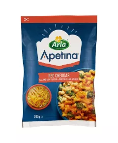 Dane produktowe Arla Apetina Ser wiórkowany Red Cheddar 200 g Składniki: MLEKO pasteryzowane, skrobia ziemniaczana (zapobiega sklejaniu się wiórek), sól, kultury bakterii kwasu MLEKOWEGO, enzym koagulujący: podpuszczka mikrobiologiczna, barwnik: beta-karoten Dodatki Marka Arla...