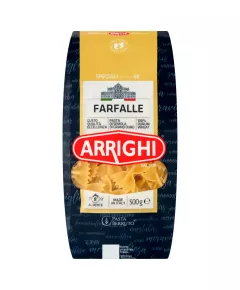 Arrighi Makaron farfalle 500 g Makaron z pszenicy durum Składniki mąka z pszenicy durum, woda 100 g Wartość energetyczna 1476 kJ / 348 kcal Tłuszcz 1,1 g w tym kwasy tłuszczowe nasycone 0,1 g Węglowodany 71 g w tym cukry 3,5 g Błonnik 3 g Białko 12 g Sól 0,01 g Zalecenia dla...