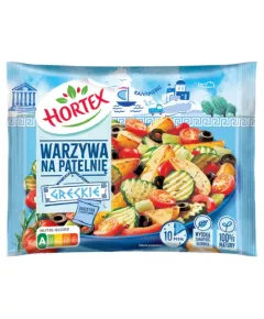 Dane produktowe Hortex Warzywa na patelnię greckie 400 g Składniki: 99 % warzywa w zmiennych proporcjach: cukinia, ziemniaki podsmażane ze skórką (ziemniaki, olej słonecznikowy (S) i/lub olej rzepakowy (R)), cebula, papryka czerwona, pomidor, oliwki (oliwki, sól), 1 % przyprawa w...