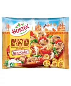 Dane produktowe Hortex Warzywa na patelnię hiszpańskie 400 g Składniki: 79 % warzywa w zmiennych proporcjach: ziemniaki podsmażane (ziemniaki, olej słonecznikowy (S) i/lub olej rzepakowy (R)), cieciorka, marchew, papryka, pomidor, 20 % pieczarki, 1 % przyprawa w saszetce (w zmiennych...