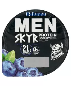 Dane produktowe Bakoma Men Jogurt kremowy typu skyr jagodowy 300 g Składniki: MLEKO zagęszczone odtłuszczone, ŚMIETANKA, białka MLEKA, jagody 1,3 %, koncentrat soku z czarnej marchwi, aromaty, substancja słodząca: sukraloza, kultury bakterii jogurtowych Dodatki Zawiera: Substancje...