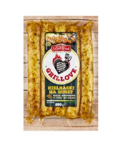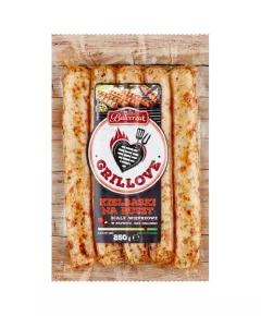 Dane produktowe Balcerzak Grillove Kiełbaski na ruszt białe wieprzowe 250 g Składniki: mięso wieprzowe (83 %), woda, sól, białko SOJOWE, błonnik PSZENNY bezglutenowy, przyprawy (w tym GORCZYCA), cukier, ekstrakty przypraw, wzmacniacz smaku: E621, stabilizator: E451, posypka 1,5 %...