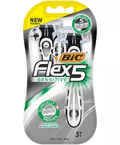 Dane produktowe BIC Flex 3 Sensitive 3-ostrzowa maszynka do golenia 3 sztuki Golarki. 3 ruchome ostrza o dłuższej żywotności. Klinicznie potwierdzony komfort skóry wrażliwej. Składniki: PEG 115M, BHT, Tocopherol, Polysorbate 20, Aloe Barbadensis Leaf Juice, Vegetable Oil, Prunus...