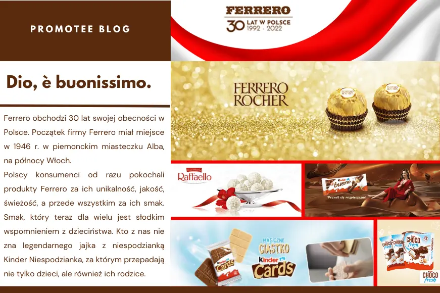 W 2022 roku Grupa FERRERO obchodziła 30 lat swojej obecności w Polsce. To właśnie w 1992 roku została podjęta decyzja o powołaniu spółki Ferrero Polska z siedzibą w Warszawie.
