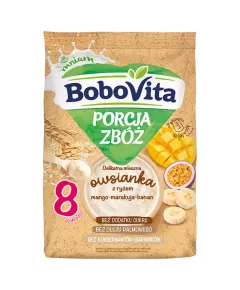Dane produktowe BoboVita Porcja zbóż Delikatna mleczna owsianka z ryżem mango-marakuja-banan po 8 miesiącu 210 g 1000 pierwszych dni 1000 pierwszych dni życia to wyjątkowy czas, w którym przez odpowiedni sposób żywienia możesz pozytywnie wpływać na zdrowie teraz i w przyszłości. Zadbaj o...