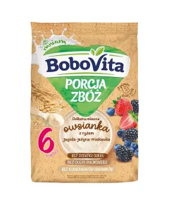 Dane produktowe BoboVita Porcja zbóż Delikatna mleczna owsianka z ryżem jagoda-jeżyna-truskawka po 6 miesiącu 210 g 1000 pierwszych dni 1000 pierwszych dni życia to wyjątkowy czas, w którym przez odpowiedni sposób żywienia możesz pozytywnie wpływać na zdrowie teraz i w przyszłości. Zadbaj o...