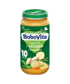 Dane produktowe BoboVita Zupa krem z królikiem i kluseczkami po 10 miesiącu 250 g Certyfikowany producent ISO 22000 100 % energii elektrycznej w naszej fabryce pochodzi ze źródeł odnawialnych Czy wiesz, że... pojemność żołądka u 6-miesięcznego dziecka jest ponad 11 x mniejsza niż u...