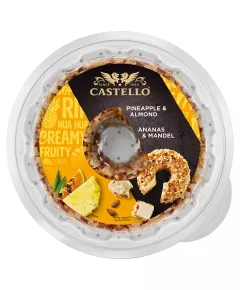 Dane produktowe Castello Serek kremowy z ananasem 1 kg Składniki: MLEKO pasteryzowane, śmietanka (z MLEKA), ananas 8,2 %, koncentrat ananasowy 5 %, MIGDAŁY 4 %, papaja 3 %, cukier, białka MLEKA, żelatyna, cukier trzcinowy, sól, mąka ryżowa, stabilizator: mączka chleba świętojańskiego,...