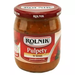 Dane produktowe Rolnik Pulpety w sosie pomidorowym 500 g Składniki: woda, pulpety 36 % [mięso z indyka 31,7 %, białko wieprzowe 28,9 %, woda, bułka tarta (mąka PSZENNA, woda, drożdże, sól), mieszanka przyprawowo-smakowa (przyprawy, sól, hydrolizat białka SOJOWEGO, cukier, oleorezyny (w...