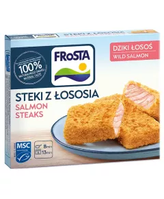 Dane produktowe FRoSTA Steki z łososia 200 g (2 sztuki) Produkt pochodzi z łowiska spełniającego standardy MSC w zakresie dobrze zarządzanego, zrównoważonego rybołówstwa. www.msc.org/pl Składniki: filety z ŁOSOSIA PACYFICZNEGO 59 % (Oncorhynchus gorbuscha), panierka sypka 20 % (mąka...