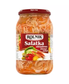 Dane produktowe Rolnik Sałatka obiadowa 850 g Składniki: woda, kapusta biała 28 %, marchew 9 %, ogórki kwaszone (ogórki, sól, przyprawy) 5 %, cebula 4 %, ocet spirytusowy, cukier, papryka 3 %, sól, przeciwutleniacz: kwas askorbinowy Dodatki Marka Rolnik Dodatkowe informacje...