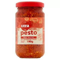 Dane produktowe Vera Pesto czerwone 190 g Składniki: olej słonecznikowy, koncentrat pomidorowy 33%, suszone pomidory [suszone pomidory 7,2%, woda, ocet winny (zawiera DWUTLENEK SIARKI), przeciwutleniacz: kwas askorbinowy] 12%, ORZECHY nerkowca, bazylia 3%, ser podpuszczkowy...