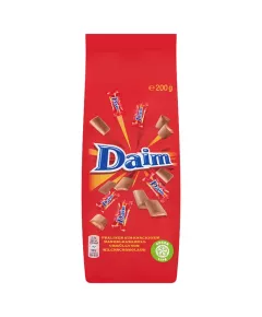 Dane produktowe Daim Czekoladki mleczne z chrupiącym migdałowo-karmelowym środkiem 200 g Składniki: cukier, olej palmowy, tłuszcz kakaowy, miazga kakaowa, serwatka w proszku (z MLEKA), odtłuszczone MLEKO w proszku, MIGDAŁY (2,9%), tłuszcz MLECZNY, modyfikowana serwatka (z MLEKA),...