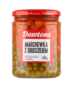 Dane produktowe Dawtona Marchewka z groszkiem 510 g Składniki: woda, marchew (32 %), groszek zielony (32 %), cukier, sól Dodatki Marka Dawtona Dodatkowe informacje Przechowywanie Przechowywać w suchym i chłodnym miejscu. Po otwarciu przechowywać w lodówce i spożyć w...