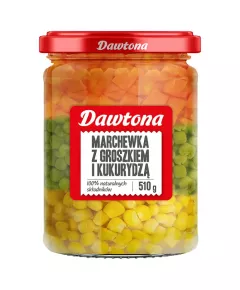 Dane produktowe Dawtona Marchewka z groszkiem i kukurydzą 510 g Składniki: woda, marchew (21,6%), groszek zielony (21,6%), kukurydza (21,6%), cukier, sól Dodatki Marka Dawtona Dodatkowe informacje Przechowywanie Przechowywać w suchym i chłodnym miejscu. Po otwarciu...