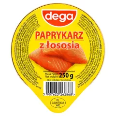 Dane produktowe dega Paprykarz z łososia 250 g Składniki: woda, rozdrobniony ŁOSOŚ 26 % (Salmo salar)*, koncentrat pomidorowy, ryż, olej rzepakowy, cebula, sól, cukier, ocet spirytusowy, przyprawy, mąka PSZENNA, ekstrakt z papryki, *Metoda produkcji - hodowla; kraj pochodzenia: A -...