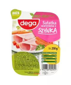 Dane produktowe dega Sałatka warzywna z szynką 250 g Składniki: ziemniaki, woda, marchew 12 %, ogórek, mięso wieprzowe z szynki, olej rzepakowy, groszek, cukier, ocet spirytusowy, sól, przyprawy i ich ekstrakty (zawierają GORCZYCĘ), skrobia modyfikowana, skrobia ziemniaczana,...