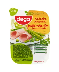 Dega Sałatka warzywna z kurczakiem 150 g Sałatka z warzywami 61%, z wędliną z kurczaka 15%. Cechy bez dodatku substancji słodzących Składniki ziemniaki, woda, mięso z kurczaka, ogórek, olej rzepakowy, groszek 8%, cukier, ocet spirytusowy, skrobia ziemniaczana, sól, skrobie modyfikowane,...