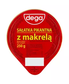Dane produktowe dega Sałatka pikantna z makrelą 250 g Składniki: rozdrobniony ŁOSOŚ 22 %, woda, koncentrat pomidorowy, marchew, rozdrobniona MAKRELA 5 % (Scomber scombrus)*, seler, cebula, pietruszka, kasza manna (z PSZENICY), olej rzepakowy, cukier, błonnik PSZENNY, ocet spirytusowy,...