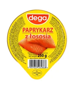 Dane produktowe dega Paprykarz z łososia 250 g Składniki: woda, rozdrobniony ŁOSOŚ 26 % (Salmo salar)*, koncentrat pomidorowy, ryż, olej rzepakowy, cebula, sól, cukier, ocet spirytusowy, przyprawy, mąka PSZENNA, ekstrakt z papryki, *Metoda produkcji - hodowla; kraj pochodzenia: A -...