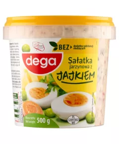 Dane produktowe dega Sałatka jarzynowa z jajkiem 500 g Składniki: ziemniaki, marchew, woda, groszek, olej rzepakowy, JAJA gotowane, cukier, sól, skrobia modyfikowana, ocet spirytusowy, przyprawy (zawierają GORCZYCĘ), żółtko JAJA w proszku, regulatory kwasowości: kwas mlekowy, kwas...