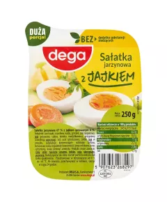 Dane produktowe dega Sałatka jarzynowa z jajkiem 250 g Składniki: ziemniaki, marchew, woda, groszek, olej rzepakowy, JAJA gotowane, cukier, sól, skrobia modyfikowana, ocet spirytusowy, przyprawy (zawierają GORCZYCĘ), żółtko JAJA w proszku, regulatory kwasowości: kwas mlekowy, kwas...