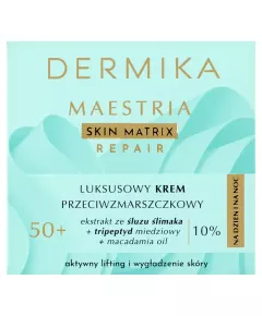 Dane produktowe Dermika Maestria Luksusowy krem przeciwzmarszczkowy 50+ na dzień i na noc 50 ml Luksusowy Krem Przeciwzmarszczkowy 50+ na dzień i na noc dla dojrzałej, wrażliwej cery po 50-tym roku życia, ma wpływ na zmniejszenie widoczności zmarszczek i spowolnienie procesów wiotczenia...