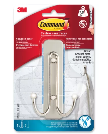 BATH36-CA Duży podwójny haczyk łazienkowy. Command™ 1 haczyk + 2 małe paski