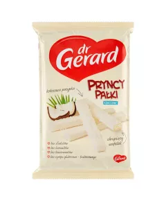 Dane produktowe dr Gerard PryncyPałki Wafelki z kremem kokosowym w polewie białej 200 g Składniki: polewa biała 40 % [cukier, tłuszcz roślinny (palmowy), MLEKO w proszku odtłuszczone, MLEKO pełne w proszku, serwatka w proszku (z MLEKA), emulgator: lecytyny (z rzepaku); aromat...