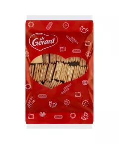 Dane produktowe dr Gerard Listki kruche maślany smak 165 g Składniki: mąka PSZENNA, polewa kakaowa 26% [cukier, tłuszcz roślinny całkowicie utwardzony (palmowy), kakao o obniżonej zawartości tłuszczu 15,5%, stabilizator: E492; emulgator: lecytyny; aromaty], tłuszcz roślinny (palmowy),...