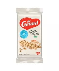 Dane produktowe dr Gerard Rolls Rolls Rurki waflowe z kremem z orzechami arachidowymi 144 g Składniki: cukier, mąka PSZENNA, ORZECHY ARACHIDOWE 15 %, tłuszcz roślinny palmowy, LAKTOZA, serwatka w proszku (z MLEKA), glukoza, kakao o obniżonej zawartości tłuszczu 1,5 %, MLEKO...
