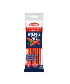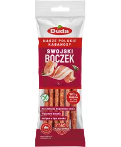 Dane produktowe Duda Kabanosy swojski boczek 95 g Składniki: mięso wieprzowe, sól, boczek wieprzowy wędzony i parzony (boczek wieprzowy, sól, aromat), białko wieprzowe, przeciwutleniacz: askorbinian sodu, glukoza, przyprawy, aromaty, cukier, regulator kwasowości: mleczan wapnia,...
