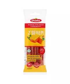 Dane produktowe Duda Kiełbasa tyrolska wieprzowo-drobiowa 300 g Składniki: mięso wieprzowe 54 %, woda, mięso z kurczaka 5 %, mięso oddzielone mechanicznie z kurczaka, skrobia, sól, stabilizatory [E451, E450, E452], substancje zagęszczające [E407a, E407], wzmacniacz smaku [E621],...