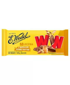 Dane produktowe E. Wedel WW Czekolada mleczna z wafelkami Peanut Butter 245 g Kto z nas nie zna WW? Chrupiący wafelek w mlecznej wedlowskiej czekoladzie to przekąska, która towarzyszy nam od lat. Teraz chrupiący WW w formie bardzo dużej tabliczki również w wersji z kremem Peanut Butter! Nie...