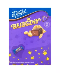 Dane produktowe E. Wedel Bajeczny Cukierki orzechowe arachidowe z wafelkami w czekoladzie deserowej 3 kg Cukierki w czekoladzie Orzeszki arachidowe, kruche wafelki Składniki: cukier, czekolada deserowa 19% (cukier, miazga kakaowa, tłuszcz kakaowy, tłuszcz MLECZNY, emulgatory: lecytyna...