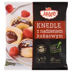 Dane produktowe Jawo Knedle z nadzieniem kakaowym 450 g Składniki: ziemniaki 52 %, nadzienie o smaku kakaowo-orzechowym 20 % [cukier, tłuszcze roślinne (rzepakowy, palmowy), kakao o obniżonej zawartości tłuszczu (10%), skrobia PSZENNA, mąka SOJOWA, serwatka w proszku (z MLEKA), gluten...