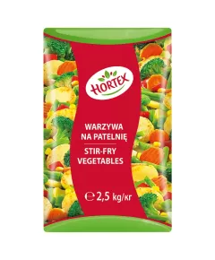 Dane produktowe Hortex Warzywa na patelnię 2,5 kg Składniki: warzywa w zmiennych proporcjach: brokuły, ziemniaki podsmażane (ziemniaki, olej słonecznikowy), marchew, papryka, fasola szparagowa, cebula, kukurydza Dodatki Marka Hortex Dodatkowe informacje www.hortex.pl...