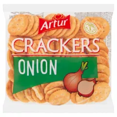 Dane produktowe Artur Krakersy cebulowe 90 g Składniki: mąka PSZENNA, tłuszcz roślinny (kokosowy), olej rzepakowy, syrop glukozowy, serwatka w proszku (z MLEKA), cebula suszona mielona 2,2%, cukier, substancje spulchniające: E 503, E 500, E 450, sól, pasteryzowana masa JAJOWA,...