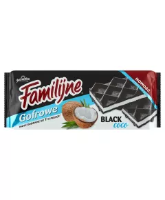 Dane produktowe Familijne Ciemne wafelki przekładane kremem kokosowym 140 g Colian Polska Firma Rodzinna Jedyne takie... - z czarnym wafelkiem - z węglem roślinnym - 23,6 % wiórków kokosowych Składniki: mąka PSZENNA, wiórki kokosowe 23,6 % (zawierają SIARCZYNY), tłuszcz palmowy,...