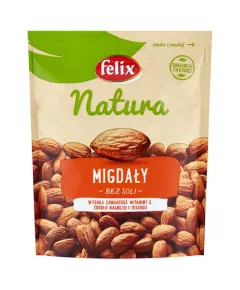 Dane produktowe Felix Natura Migdały 200 g Poznaj prawdziwego superbohatera wśród przekąsek. Słodkie nasiona migdałowca mogą pochwalić się mocą witaminy E, fosforu czy błonnika. Zawierają też magnez, który pomaga walczyć ze stresem. Dzięki temu migdały możemy zaliczyć do grona tzw....