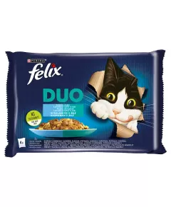 Dane produktowe Felix Duo Karma dla kotów rybne smaki w galaretce 340 g (4 x 85 g) Pełnoporcjowa karma dla dorosłych kotów. Karma odpowiednia także dla kotów wysterylizowanych. Składniki: z pyszną mieszanką Dorsza Czarnego i Łososia w Galaretce: mięso i produkty pochodzenia zwierzęcego*...