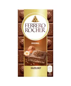 Dane produktowe Ferrero Rocher Czekolada deserowa nadziewana z orzechowym nadzieniem i kawałkami orzechów 90 g Jesteśmy zaangażowani w pozyskiwanie 100% naszego kakao ze zrównoważonych źródeł. Składniki: cukier, miazga kakaowa, ORZECHY LASKOWE 12 %, olej palmowy, tłuszcz kakaowy, kakao...