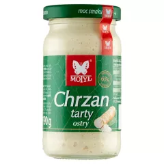 Dane produktowe Motyl Krem chrzanowy 185 g Składniki: olej rzepakowy, woda, 13% korzeń chrzanu tarty (zawiera przeciwutleniacz: PIROSIARCZYN SODU), MLEKO w proszku pełne, ocet spirytusowy, cukier, musztarda (woda, ocet spirytusowy, GORCZYCA biała, sól), sól, skrobia modyfikowana...