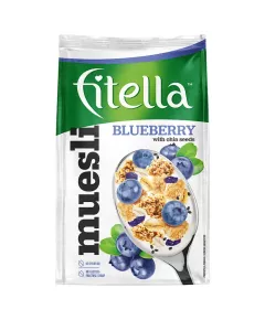 Dane produktowe Fitella Musli chrupkie borówkowe z nasionami chia 300 g Źródło błonnika pokarmowego. Składniki: 78 % musli crunchy [płatki OWSIANE pełnoziarniste, cukier, kulki PSZENNE (mąka PSZENNA, mąka kukurydziana, otręby PSZENNE, cukier, sól), olej rzepakowy, wiórki kokosowe, mąka...