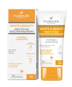 White&Beauty Krem do rąk przeciwstarzeniowy wybielający przebarwienia 45 ml  Krem sprawia, że dłonie wyglądają młodziej. Pomaga rozjaśnić intensywność przebarwień oraz wyrównuje koloryt skóry. Odczuwalnie nawilża i odpowiednio natłuszcza. Łagodzi uczucie suchości i szorstkości, chroni...