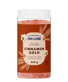 On Line Cinnamon Gold sól do kąpieli z niepowtarzalną kompozycją zapachową, która łączy aromaty korzennych przypraw, piżma, słodkich kwiatów i wanilli. Wyjątkowy zapach, który odpręża.  Ostrzeżenie: chronić przed światłem  Sposób użycia: 3 nakrętki soli wsypać do wanny pod strumień...